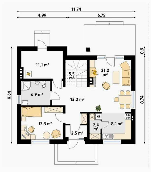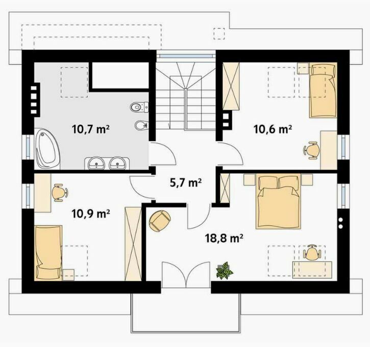 Kompaktowy charakter domu – cztery pokoje, salon z jadalnią oraz dwie łazienki to optymalna opcja dla rodzin z jednym lub dwójką dzieci. Jednocześnie powierzchnia działki zapewnia dodatkową przestrzeń do relaksu czy zabawy na świeżym powietrzu.